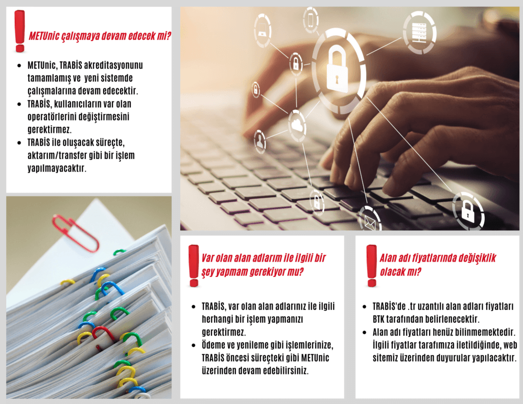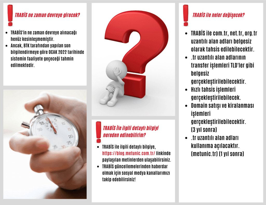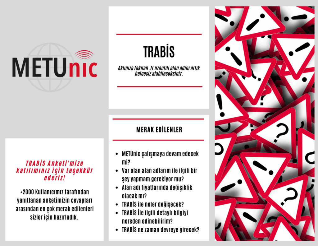 Trabis açılışı öncesinde, 11 Eylül 2022 – 14 Eylül 2022 tarihleri arasında, bir geçiş süreci gerçekleşecektir. Bu süre içerisinde .tr alan adları için tahsis, yenileme ve güncelleme işlemleri nic.tr tarafından yapılmayacaktır. O tarihler arasında alan adı yenilemesi veya DNS değişikliği yapılması mümkün olamayacağından alan adlarınızla ilgili bu tür ihtiyaçlarınızın öne alınması önem arz etmektedir.